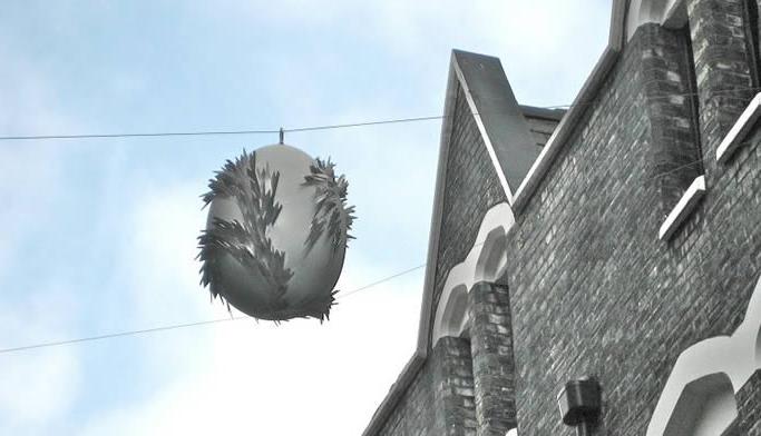 High up in the air hangs a 3ft egg with a seamless flock of folded aluminium birds surrounding it. The art piece – looming over Foubert's Place, just off Carnaby Street – is made by a London artist and designer Gregory Epps –