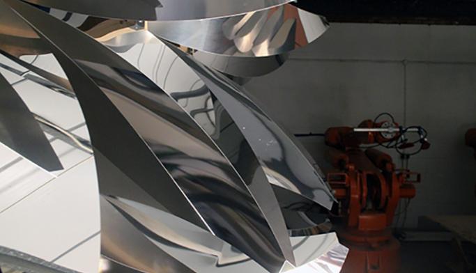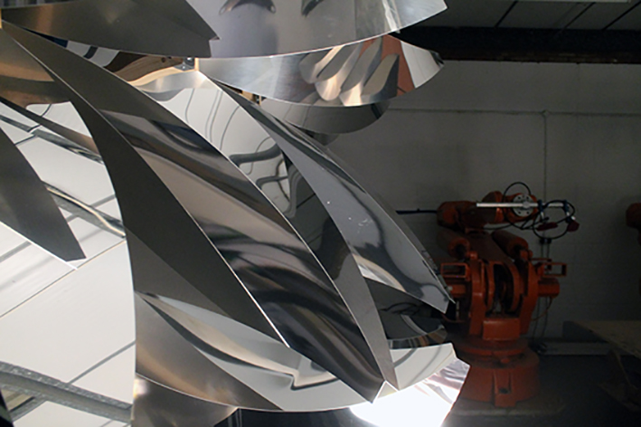 This was a three day facade workshop with Leeds Metropolitan University including introduction into paper hand folding, robots.io tutorial, design consultation and fabrication in polished metal.